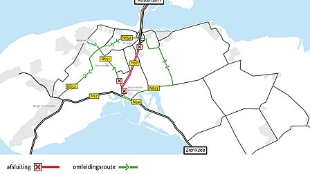 Verkeer vanuit Noordwelle, Ellemeet en Burgh-Haamstede wordt omgeleid via de N652. Verkeer vanuit Serooskerke wordt omgeleid via de N653 en de Elkerzeeseweg. Deze omleidingsroutes staan met gele borden aangegeven.
